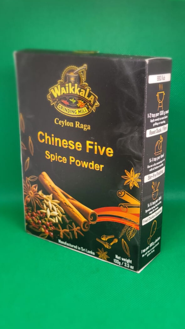 Manufactured by Waikkala Grinding Mills Pvt Ltd, Waikkala, Sri Lanka, this Chinese Five-Spice Powder is made from a blended mix of star anise, fennel seed, Ceylon cinnamon, Ceylon black pepper, and Ceylon clove. The ingredients are carefully processed and finely milled to ensure consistent aroma and flavor. This seasoning is suitable for use in Chinese-style cooking, including BBQ rubs, roast duck and pork seasoning, stir-fry finishing, and fried chicken seasoning. It may also be used in global cuisines as a dry rub for grilled meats, seasoning for roasted vegetables, flavoring for noodles and rice dishes, and as a spice component in marinades and fusion recipes.